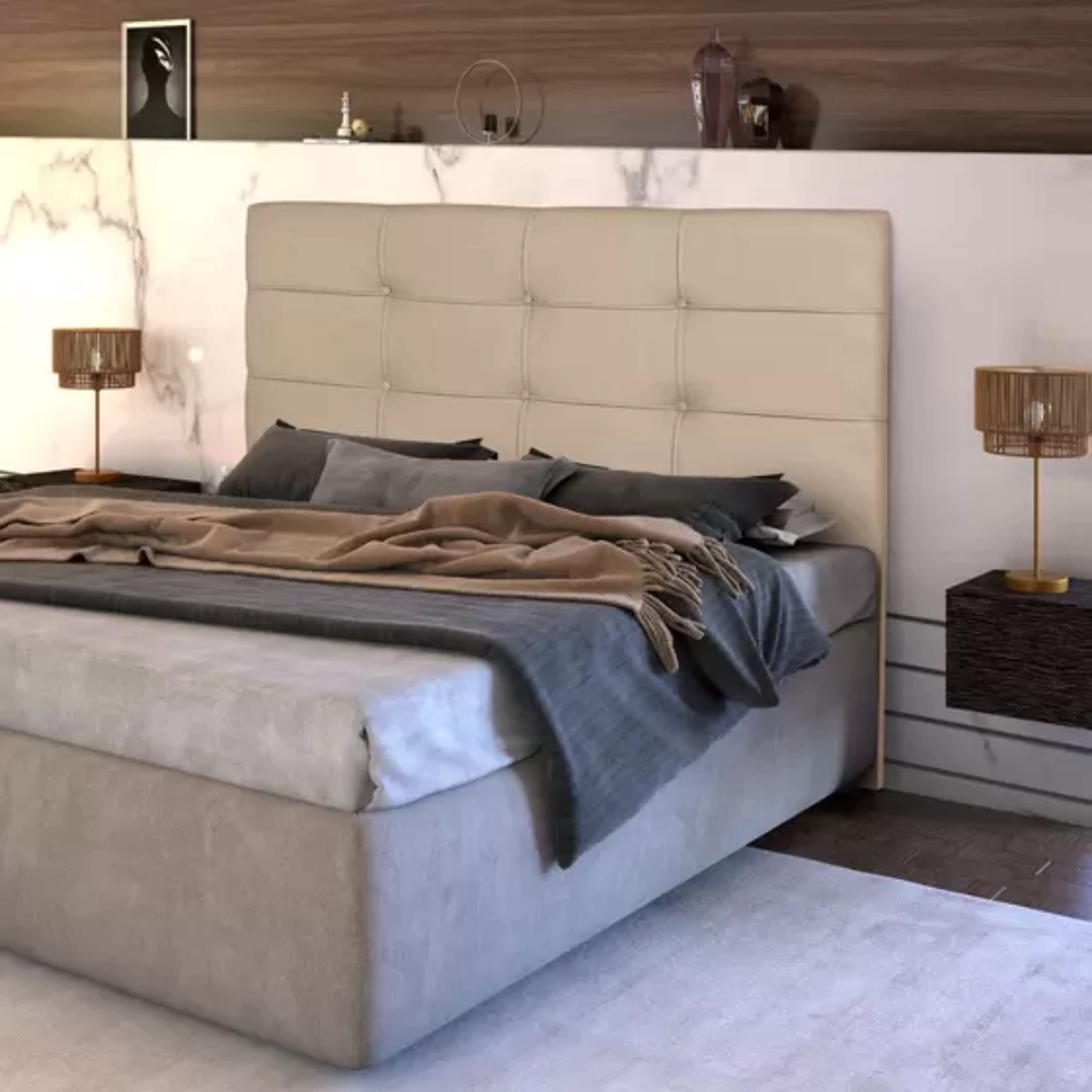 A Cabeceira Eslovênia possui um design elegante com detalhes refinados, como costura decorativa e botões estofados. Este visual clássico e atemporal adiciona um toque de sofisticação ao seu quarto.