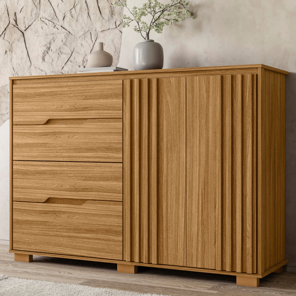 As duas portas ripadas proporcionam acesso fácil e discreto ao interior da cômoda, ideal para armazenar roupas dobradas, lençóis e outros itens. As quatro gavetas espaçosas oferecem espaço adicional para organizar suas roupas íntimas, meias e acessórios.