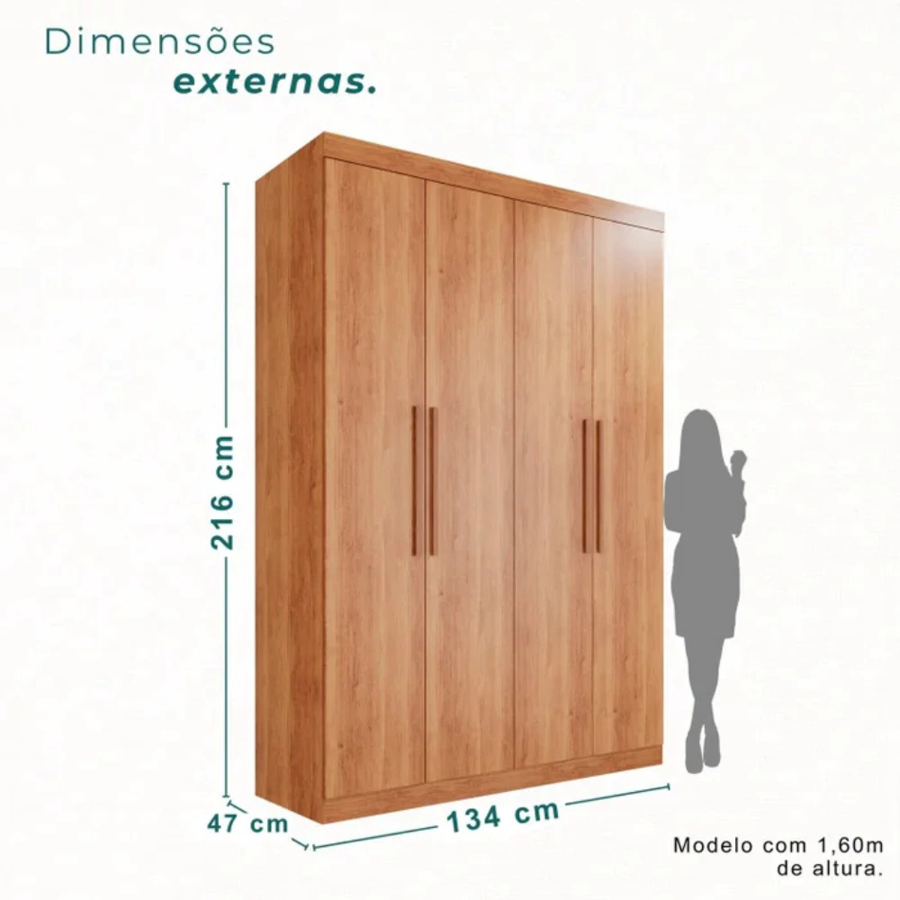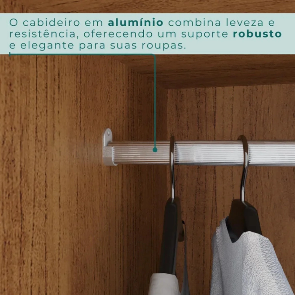 Conta com 4 portas de abrir, 3 gavetas com corrediças telescópicas e 1 cabideiro metálico/alumínio, para otimização de espaço